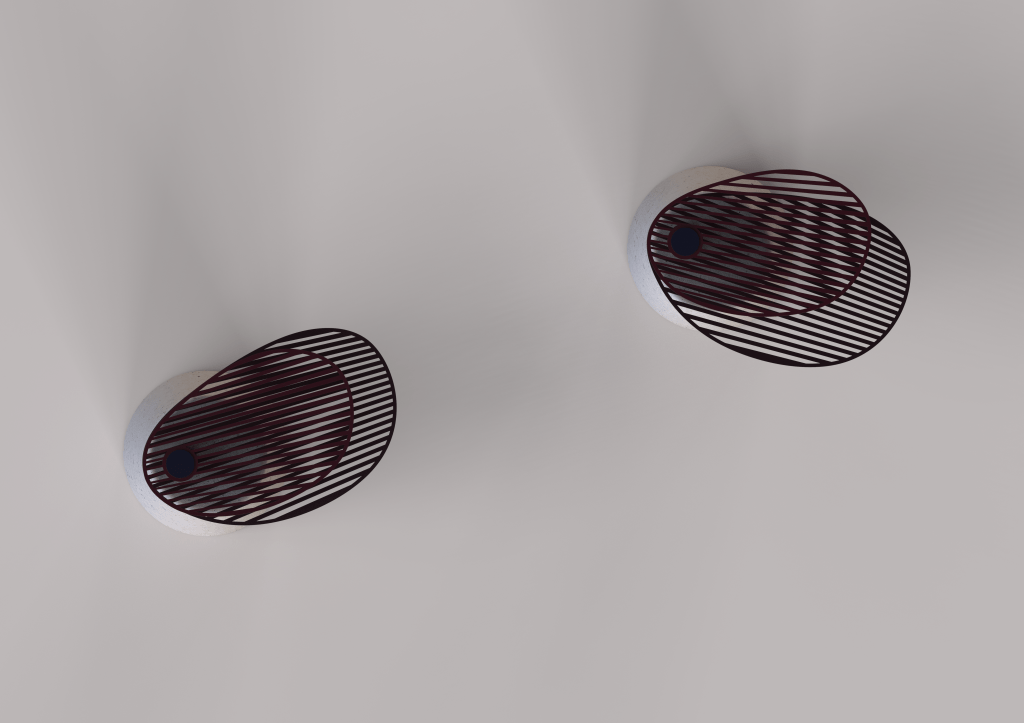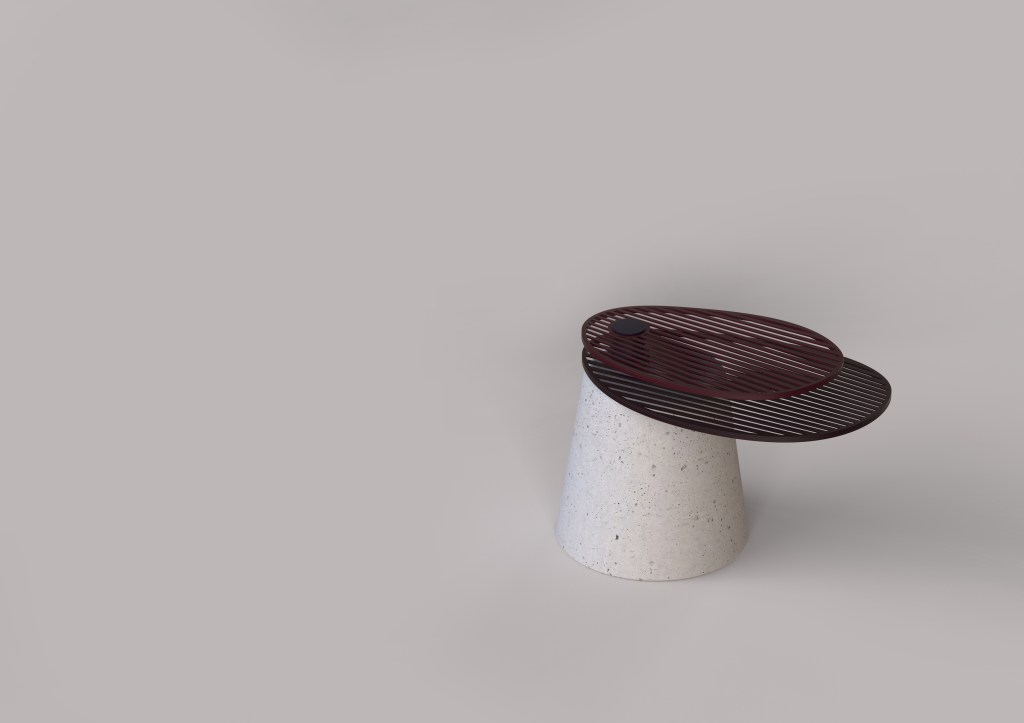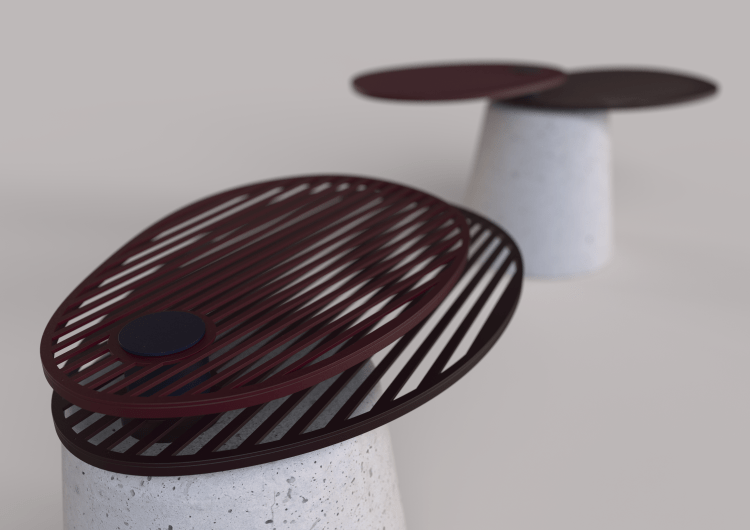 This table is made of a concrete base. This heavy and massive piece contrasts with the two light aluminum petals. These two parts can be unfolded to extend the capacity of the table. This way, the movement of the overlaid petals creates an optical effect.