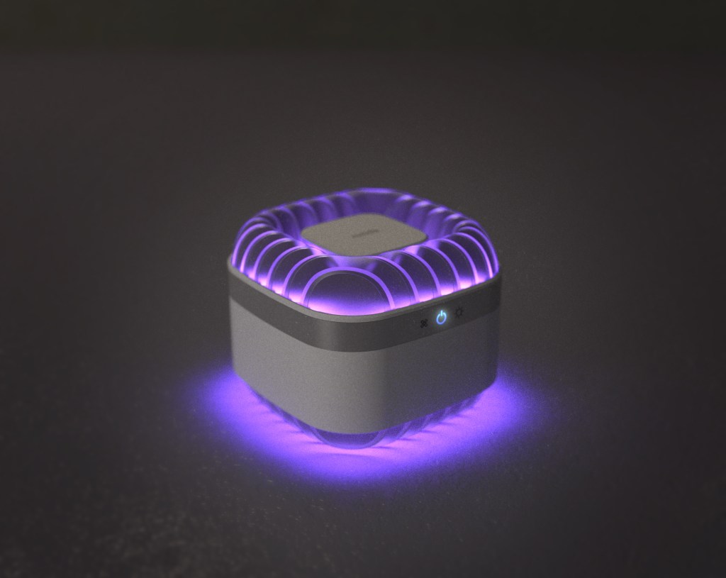 Trap which attracts insects through blue light reflection. When the insects are close to the light, they are sucked up inside the box by a fan. The aesthetic of this product lies in the contrast between straight and minimalistic shapes and lighter, more curved forms at the extremities. The product’s function is immediately clear, with slats that let air through. They evoke air movement and fluidity. The color and translucency of the slats also play an important role, diffusing blue light.